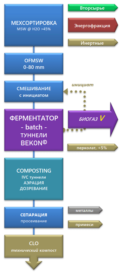 Технологія сухої анаеробної ферментації, циклічного -batch- або безперервного -conti- типу, для отримання біогазу, біометану (збагачений біогаз) з органічних відходів.